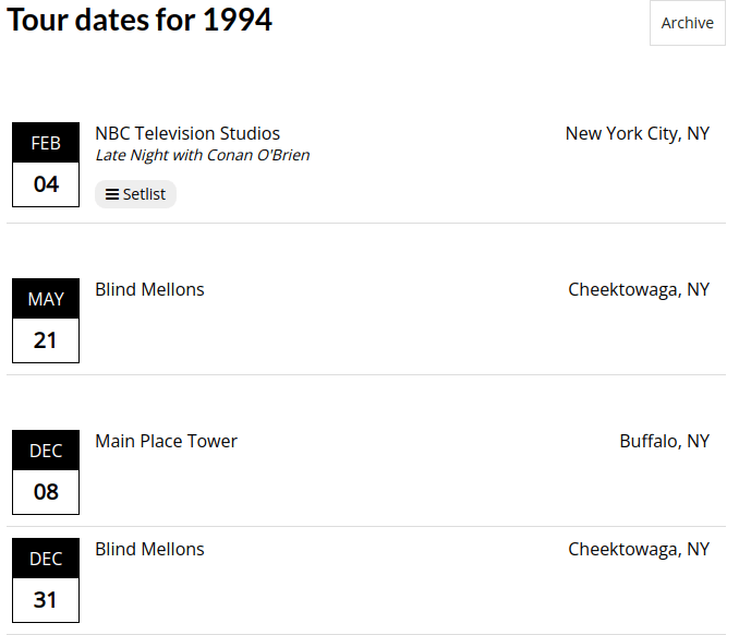 A good starting point to analyze 1994 is, once again, provided by the good folks at GooGooFans. Let’s take a look at their tour archive for that year.