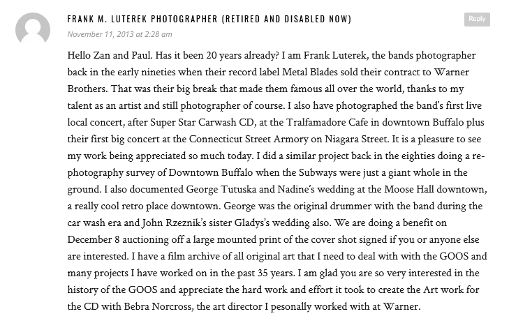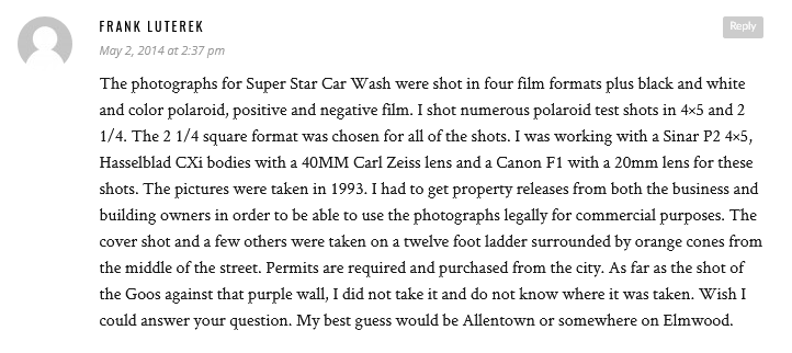 Within the comments of the aforementioned blog post, a wild creature appears! Joking. The original photographer for the album, a gentleman named Frank M. Luterek, published a comment claiming to be the one who actually worked on the car wash photos for the band, which he personally took. Below is his comment. Interestingly, he also took pictures of former drummer George Tutuska‘s and John’s sister Gladys’ weddings.