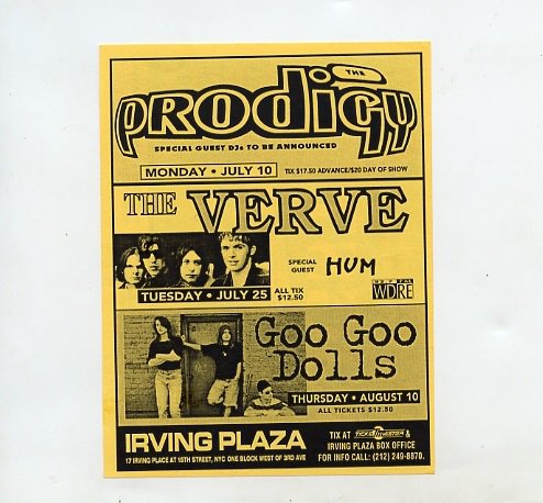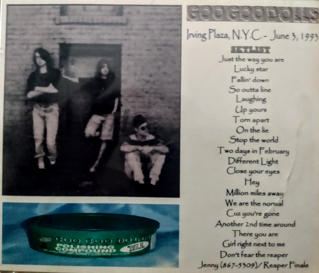 On June 3rd, 1993, the Goo Goo Dolls performed at the Irving Plaza in New York. (the setlist.fm entry features a wrong track listing). This is another great performance boosting a total of 21 songs and a running time of slightly more than 60 minutes. What stands out here is their execution for the cover song “867-5309 / Jenny“. Thanks to a recent post of ours, we know the band wanted to record a cover version of it for their fourth effort. They seemed to like it a lot, and have been playing it quite a few times during the 1990’s. I believe this concert shows off how the recorded song would have sounded. I get the sense this version is how it was intended to appear on “Superstar Car Wash”, and I speculate so because it sounds different than the other versions I’ve heard, that is more musically aligned with the album’s harmonic mood. Below you can see a very rare poster for the show (Many thanks to contributor Bailey for the picture).