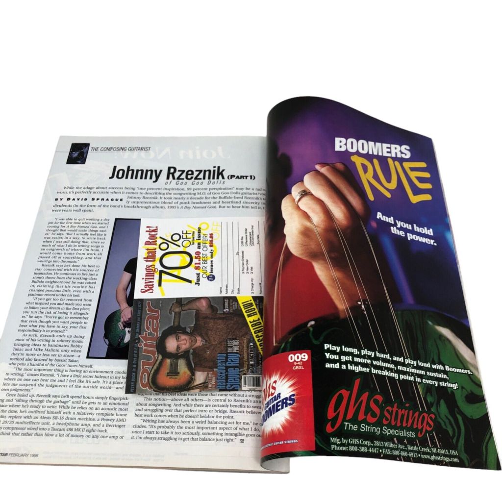 Unfortunately, John’s photo is mostly covered by that promo discount pamphlet. The magazine is “Guitar World” and the issue is the February 1998 one. I believe it should be this one.