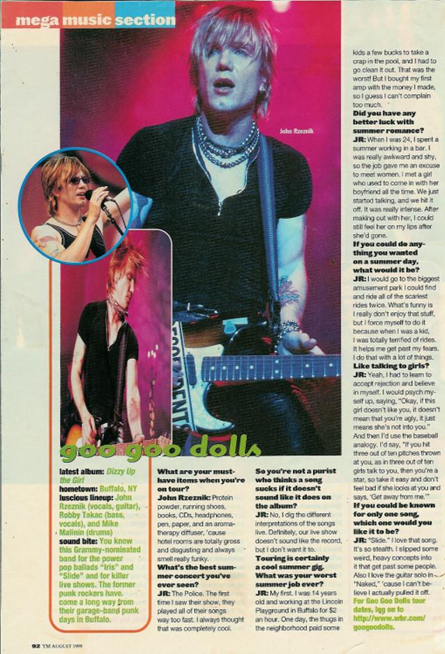 1. Makes sense. Have you read that one interview I shared a while back from 1991?? It’s called “goo goo dolls-wild and crazy guys” I think. John admitted some things that went on when he had to share a bed with Robby in a hotel room on tour, and I was feeling so uncomfortable reading it! He really had no filter, that’s for sure! I’ve listened to so many live shows from the early days and he and Robby would just talk and talk about things- they were so open with their fans! You could also see it in the way they dressed. Some of johns outfits just made me laugh! There was one picture I saw where he was wearing pink and white striped capri pants, white track shorts over the top (!!) and this cropped t-shirt thing. If you hadn’t know it was him, you easily would’ve mistaken him for a girl! It’s kinda refreshing though because it was like they really didn’t care at all. Once fame hit though, it all changed. It’s understandable because of totally obsessed fans, yes. Some people are scary…