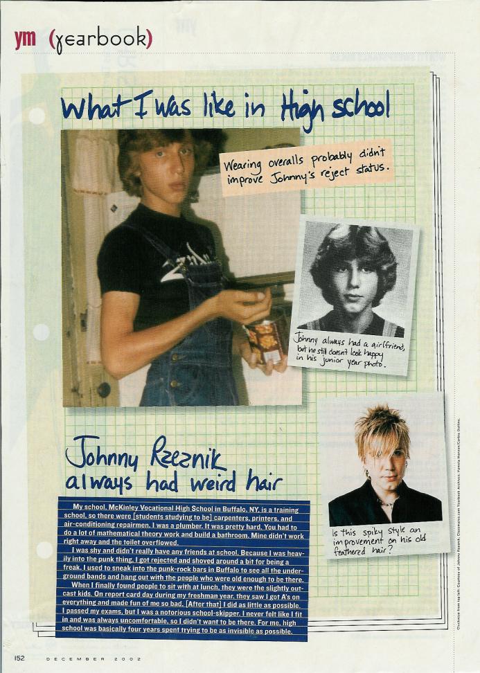 Those are all the magazine covers I have to share today. I’m sure I’ve shared others in the past, so I don’t need to show them again. Now I have one last thing to share: The article about John’s high school years. This article (or clip of one, at least) was one I’d been looking for for a long time. I think it was featured in a magazine somewhere (circa ’99) but I don’t know where. This featured talk about John’s vocational high school, McKinley High in his hometown of Buffalo New York. He explains some of the reasons he didn’t like high school, and why he liked to skip. This kind of ties into this one article I read on temple of goo one time, where John explains getting bullied by some of the other kids. In this article, it’s because of his grades. We also get a little explanation on becoming a Plummer, which he obviously scrapped. I heard somewhere that this didn’t completely go away though. He apparently fixed a toilet for his sister back during the ABNG era. The person who put together the page also put more captions under the other pictures. I’ve seen both of his teenage pictures before, and have also shared them with Temple Of Goo. Under his high school picture is says he always had a girlfriend but never looked happy. I can make a lot of speculations there, but it could simply be the fact that it was a school picture. It says it was his junior picture, but on the date I found that yearbook picture, it was actually his sophomore one. There was also a caption saying “wearing overalls probably didn’t improve Johnny reject status”. Which now that I think about it, he did used to wear overalls a lot when he was younger. Maybe this is just my opinion here, but I think he looked pretty good in overalls.