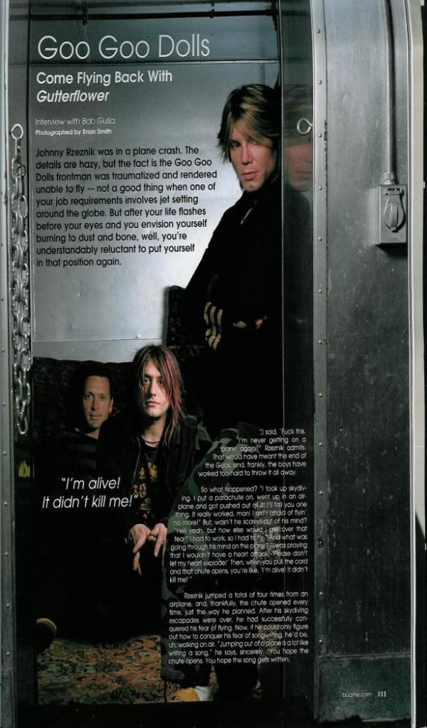 The first one is from ’02, called “Goo Goo Dolls come flying back with Gutterflower”. I do have part of the article with this one, but it’s not attached in order. That article talks about the new album as well as the plane crash the Goos got themselves in back in late ’99. John talks about how he got over his fear of flying, etc. Also just a side note here, if anyone has any of these articles, I’d love to see them!