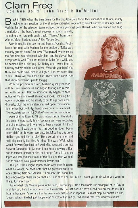 The third one features Mike on Modern Drummer. I think this was the June ’02 issue (sorry if I got dates wrong there) and talks about the release of Gutterflower just a couple months prior. I do actually have the article on that one, at least most of it. It’s also not in order, but it features a picture of John in a Ramones shirt. The article talks about how Mike recorded the drums for GF in just three days! And John talks about how incredible of a drummer Mike is, etc.