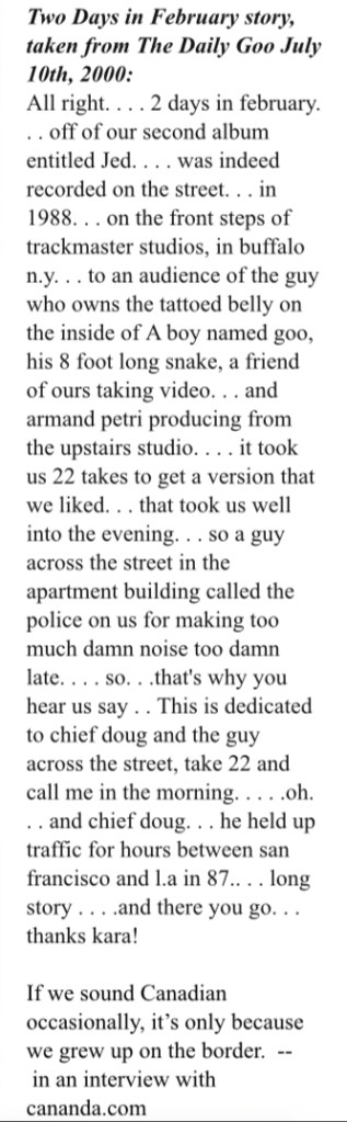 The first one I’m going to share is actually just a screenshot from an archived “Daily Goo” post, which was something the Goo Goo Dolls put on their website back in the late 90s, early 2000s to tell fans what was new, the tour, etc. This one was about the recording of Two Days In February. Now me, being quite into the song, was very excited to find this. Wondering who the “guy across the street” is? Who the other mysterious man standing between John and Robby? (See this video I send Temple of Goo a while back) Now I don’t think they said this, but this was recorded on the steps of Trackmaster Studios. I’d seen a comment saying that they’d recorded it on the side of a street in Boston, but I didn’t believe it. Apparently, Chief Doug was someone who held up traffic? Not sure.