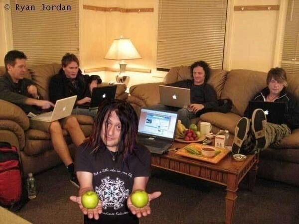 This one’s a bit of a pun: Everyone is on their apple computers, and Robby is holding up two apples! I think this is hilarious!