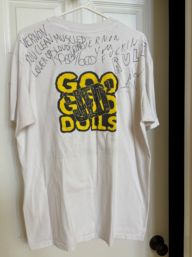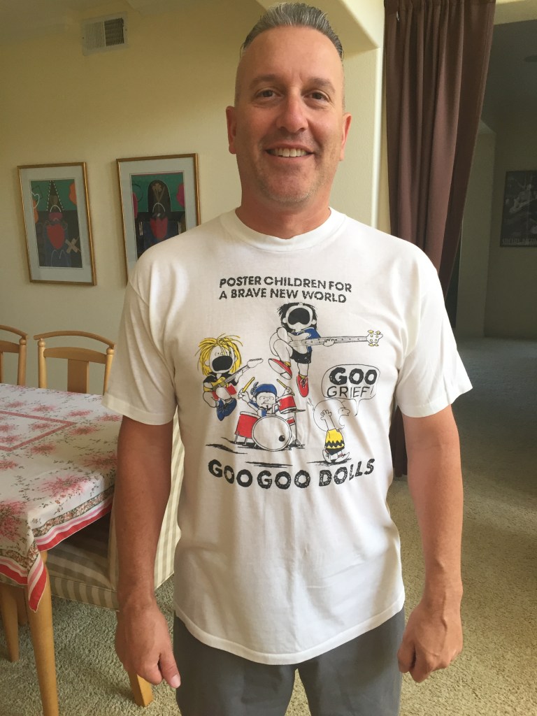 One of the photos […] is my husband Vernon wearing a GGD shirt from the late 1980s that he still has. The back of it has all the signatures of the band. I guess I need an another photo! The other two photos are when my nieces Julie and Jenna along with their friend ran into the GGD in 2007 outside the Craig Ferguson show. We were on a private tour of CBS Studios and we decided to go upstairs since I heard music that seemed familiar. We get out of the elevator to the side entrance of the soundstage and there they were Robby and Johnny. Robby recognized me. They were sweet to take photos with my nieces.